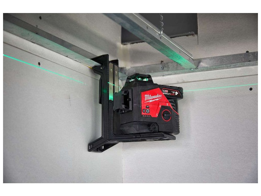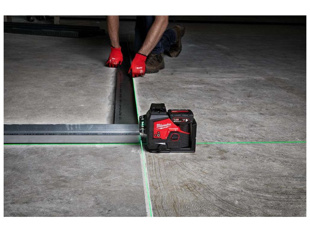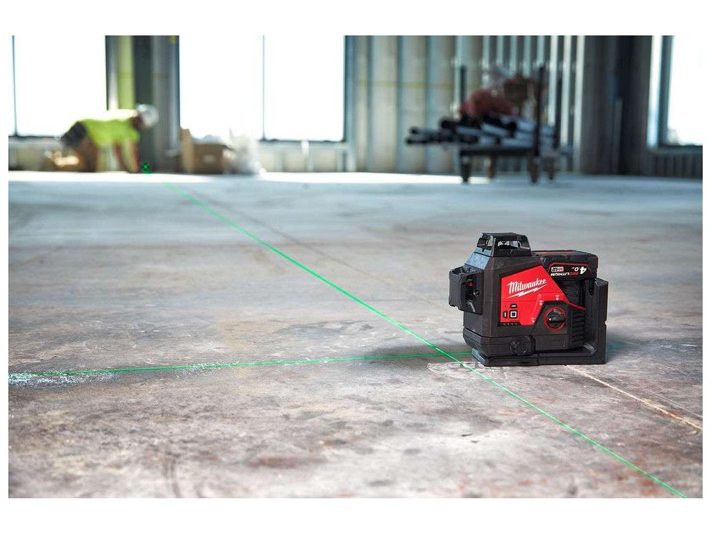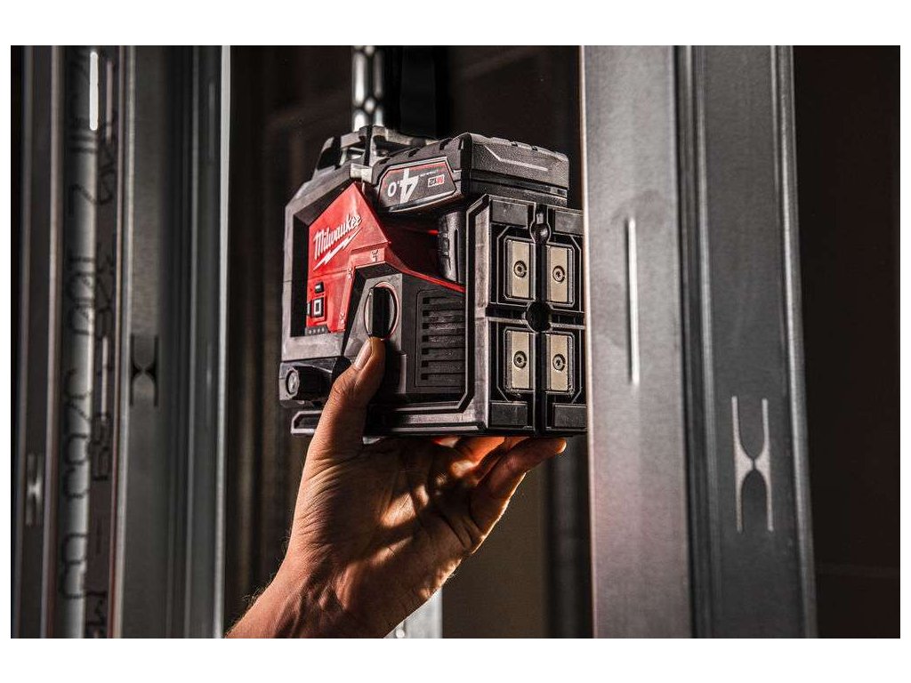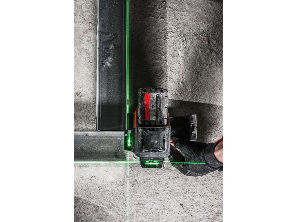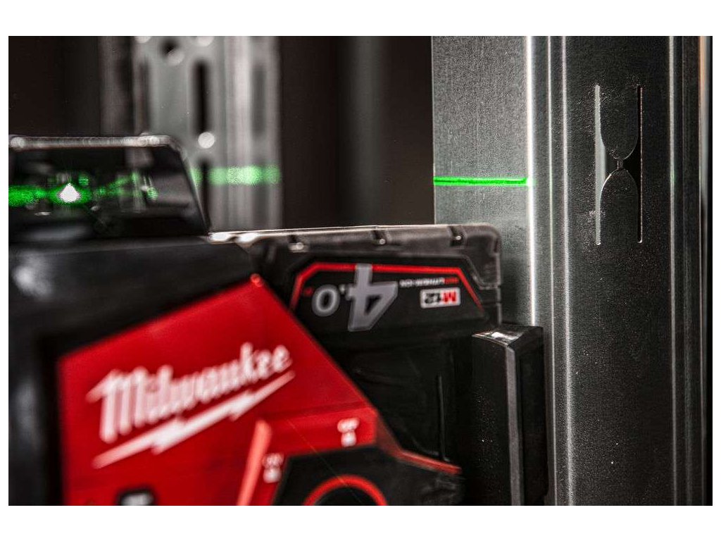 Laser 360 ° so zeleným lúčom a 3 rovinami, otočný, pracovný dosah 38 m, s magnetickým držiakom, krytie IP 54 proti prachu a striekajúcej vode, batériový (4Ah) - Milwaukee M12 3PLKIT-401C.
