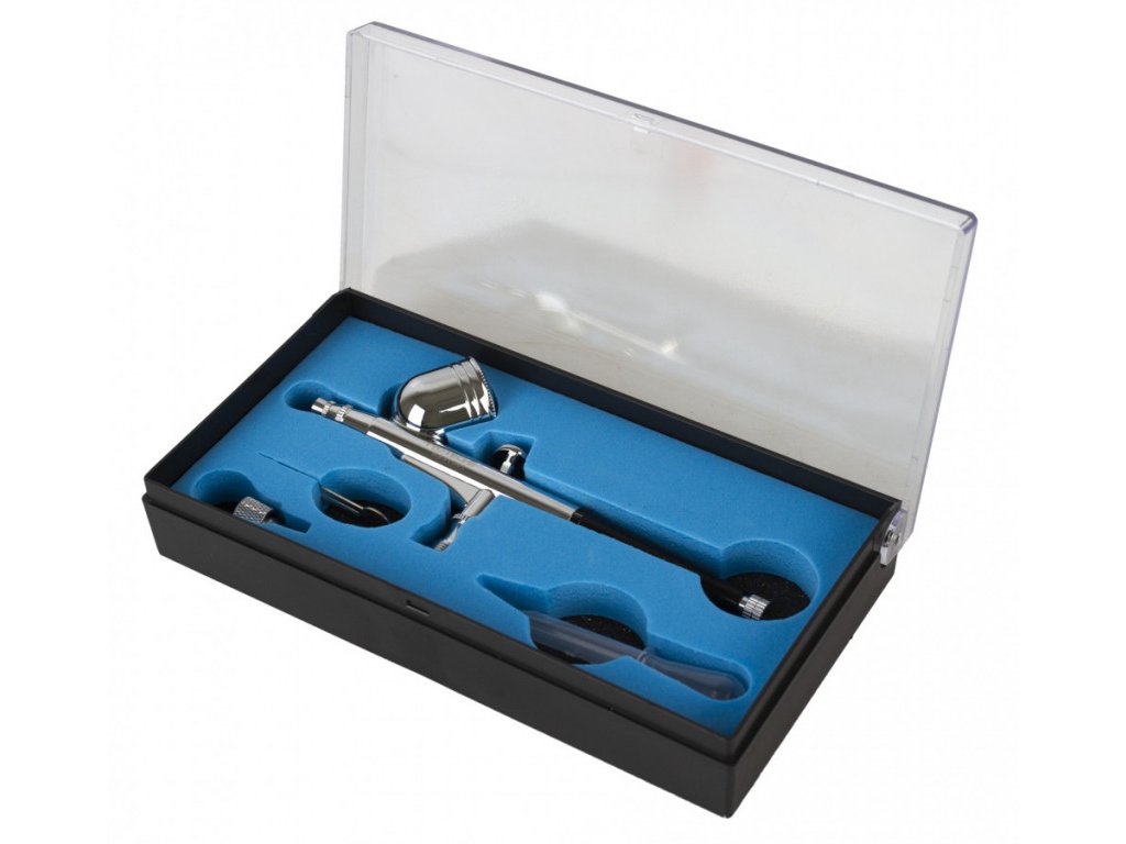 Striekacie airbrush pištole dvojčinná, sa skrutkovacie tryskou 0,3 mm a šálkou na 7 ml laku, v plastovej kazete - Hoteche HTA831301