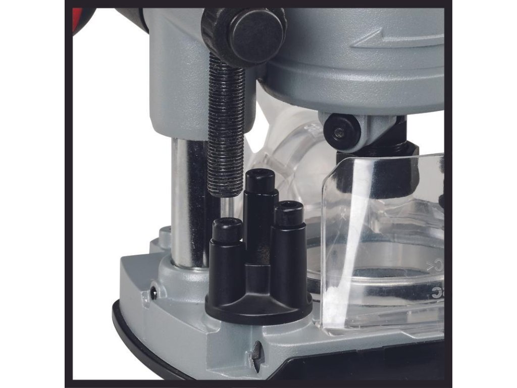 Systém vodiacich líšt umožňuje rozmerovo presné frézovanie. Je vybavený dvoma skľučovadlami (6 a 8 mm) pre rôzne frézy a umožňuje jednoduchú výmenu nástrojov vďaka aretácii vretena. Pracovná plocha je optimálne osvetlená LED diódou, zatiaľ čo plastová vložka chráni povrch obrobku pred poškriabaním aj pri náročných a drsných aplikáciách. Ergonomická rukoväť zabezpečuje pohodlnú prácu, zatiaľ čo kryt chráni pred trieskami v zornom poli.