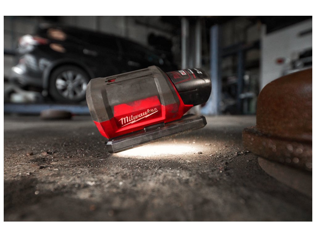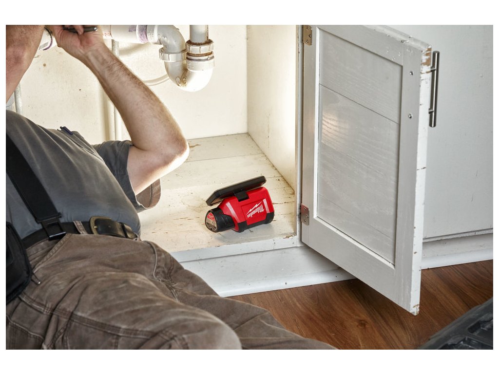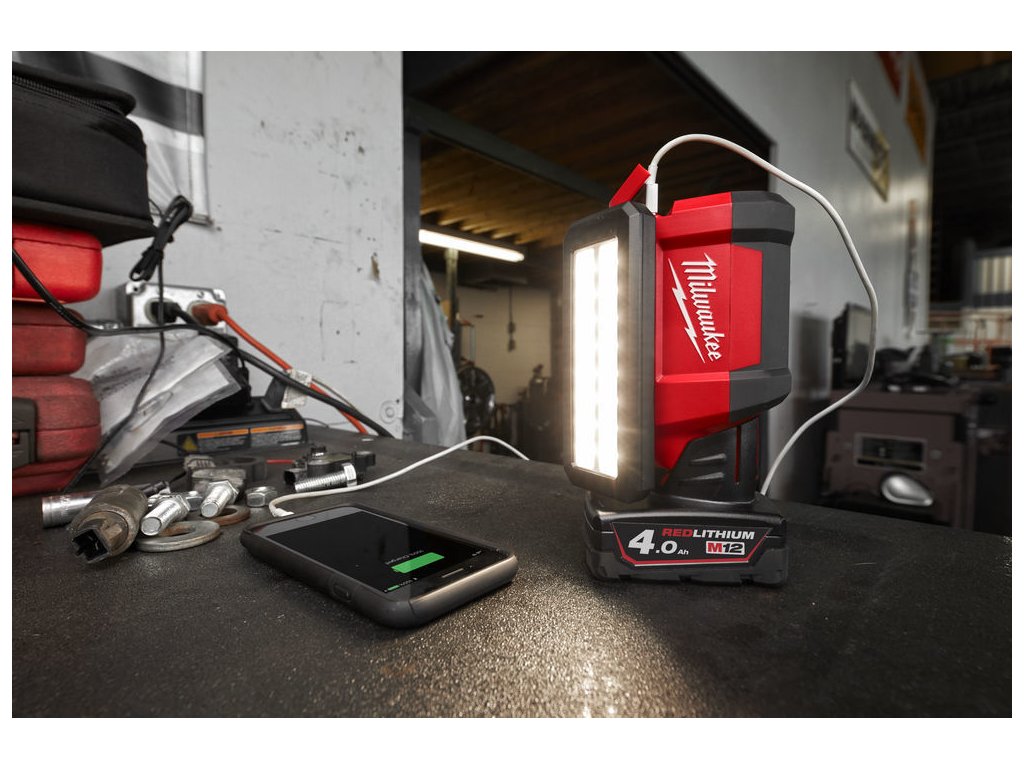 Batériová – akumulátorová lampa (reflektor), svietivosť 700 lúmen, s magnetmi, otočnou hlavou a portom USB na nabíjanie ďalších zariadení – Milwaukee M12 PAL-0