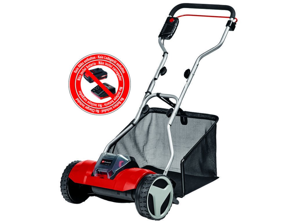 Batériová – akumulátorová kosačka na trávu s rotujúcim vretenom, záber 38 cm, s nastavením výšky kosenia a zberným košom – Einhell Expert GE-HM 18/38 Li-Solo