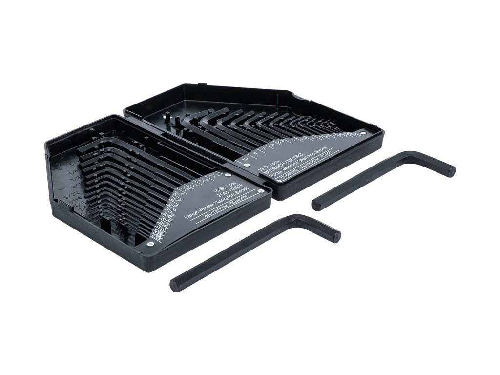 - 15x imbusový kľúč palcový: 0,028" - 0,035" - 0,050" - 1/16" - 5/64" - 3/32" - 7/64" - 1/8" - 9/64" - 5/32" - 3/16" - 7/32" - 1/4" - 5/16" - 3/8"