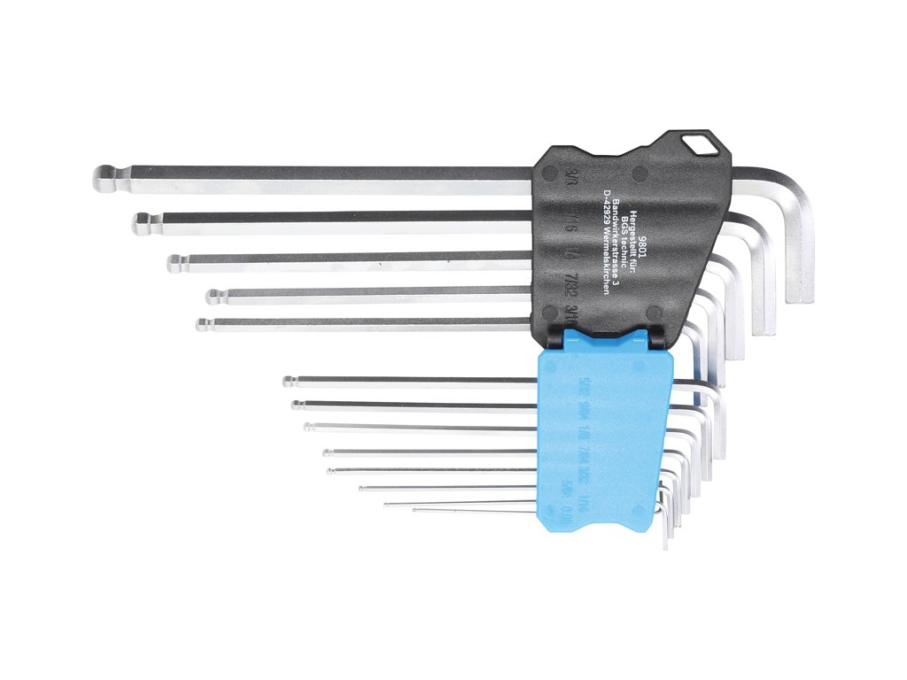 Sada zahnutých kľúčov "L-Wrench" Imbus (HEX), palcové (imperiálne, palcové) veľkosti 0,05" až 3/8", dlhá strana s guľôčkou, sada 13 kusov v puzdre - BGS technical 9801