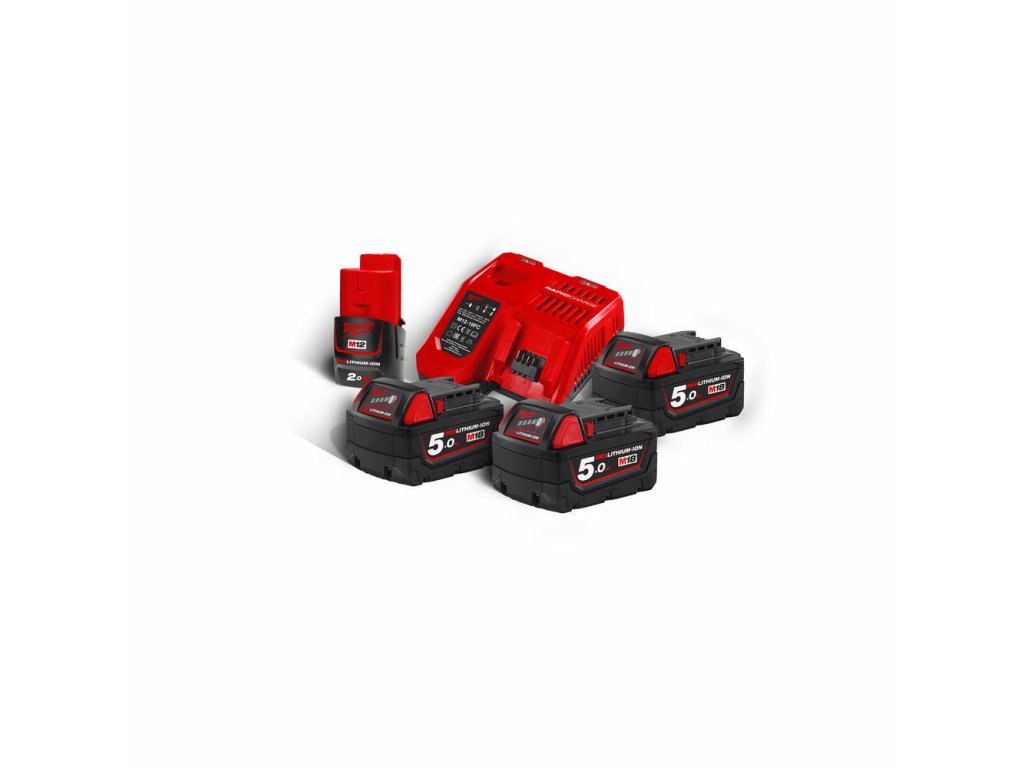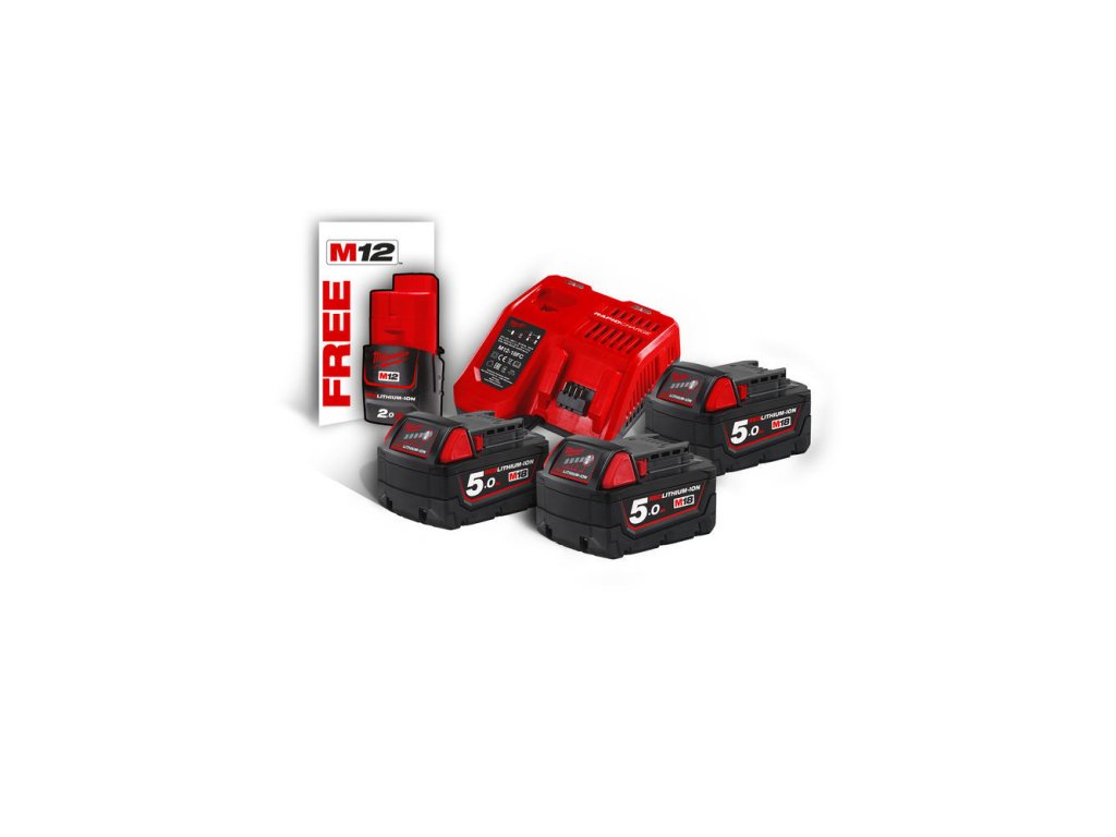 Súprava na pohon aku náradia: tri 18V batérie 5,0 Ah a jedna 12V batéria 2,0 Ah s rýchlonabíjačkou – Milwaukee M18 NRG-503