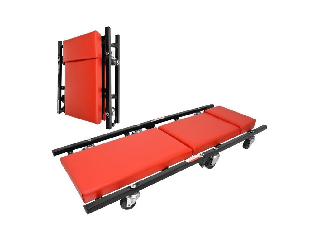 Skladacie pojazdné montážne ležadlo s vinylovým čalúnením, sa 6 otočnými nylonovými kolieskami s guličkovými ložiskami as masívnym kovovým rámom má rozmery 920 x 380 x 95 mm.