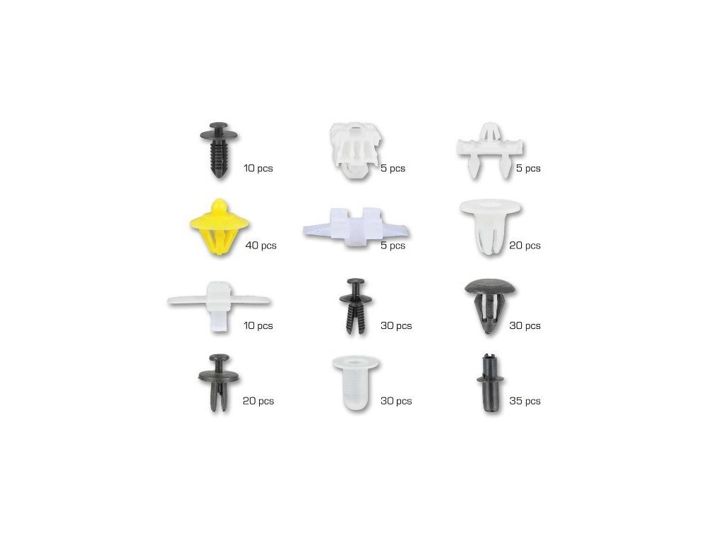 Súprava spotrebného materiálu pre opravy interiérov automobilov značky Mercedes-Benz. Obsahuje príchytky 12 rôznych druhov.