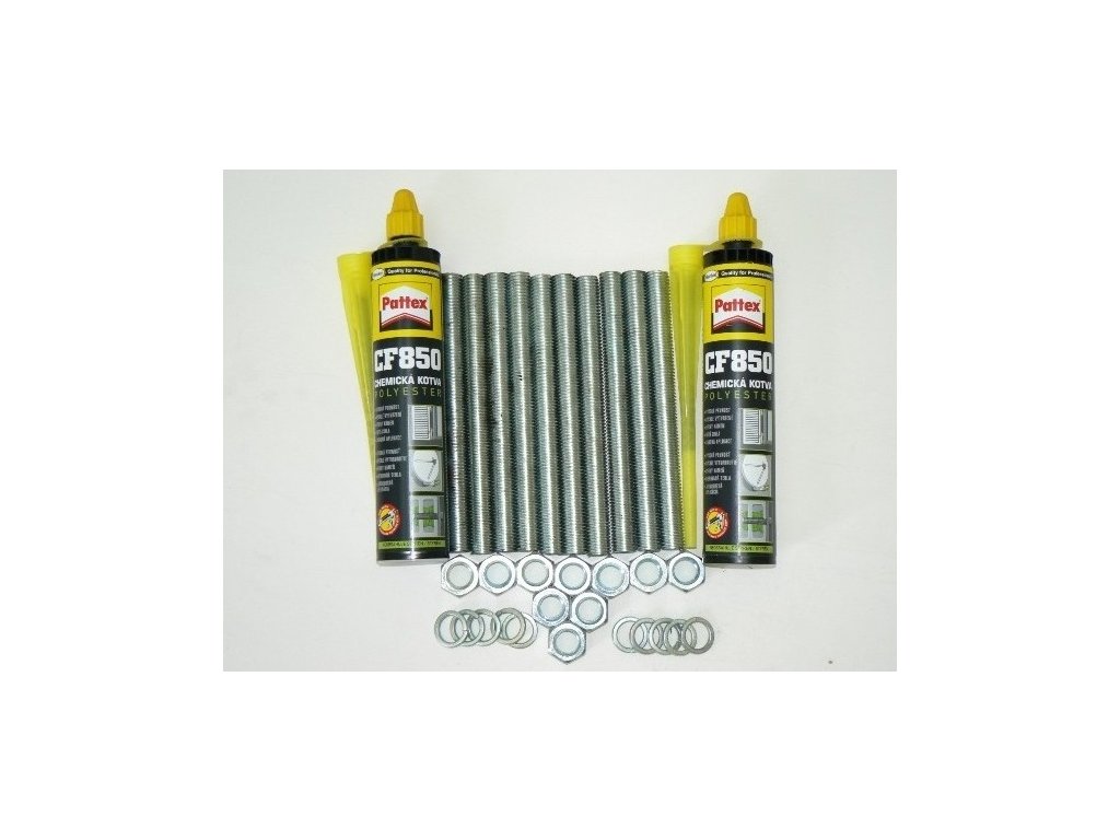 Set obsahuje vysoko kvalitné chemické kotvy renomovanej značky Pattex (2x kartuša objeme 280 ml) a dvanásť nerezových závitových tyčí, matiek a podložiek.