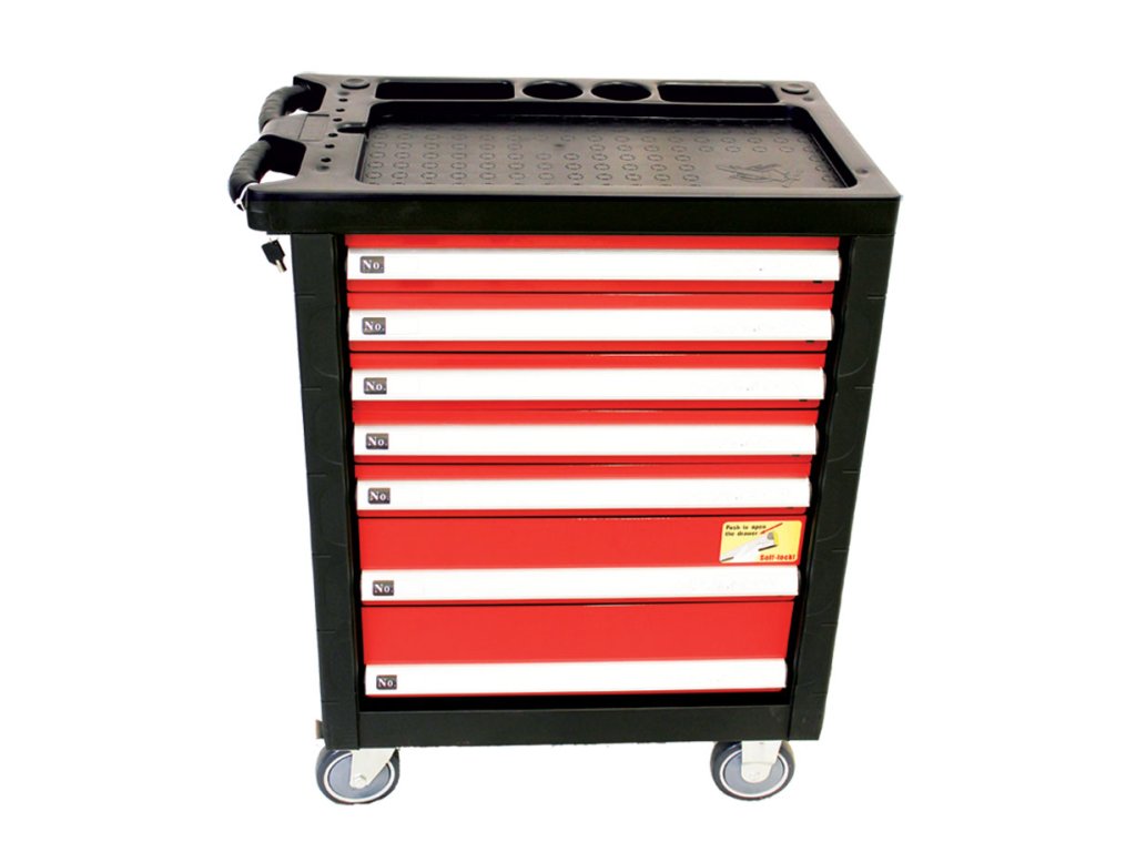 Pojazdný servisný vozík na náradie so siedmimi zásuvkami, centrálnym zamykaním a poistkou proti otvoreniu na každom šuplíku.