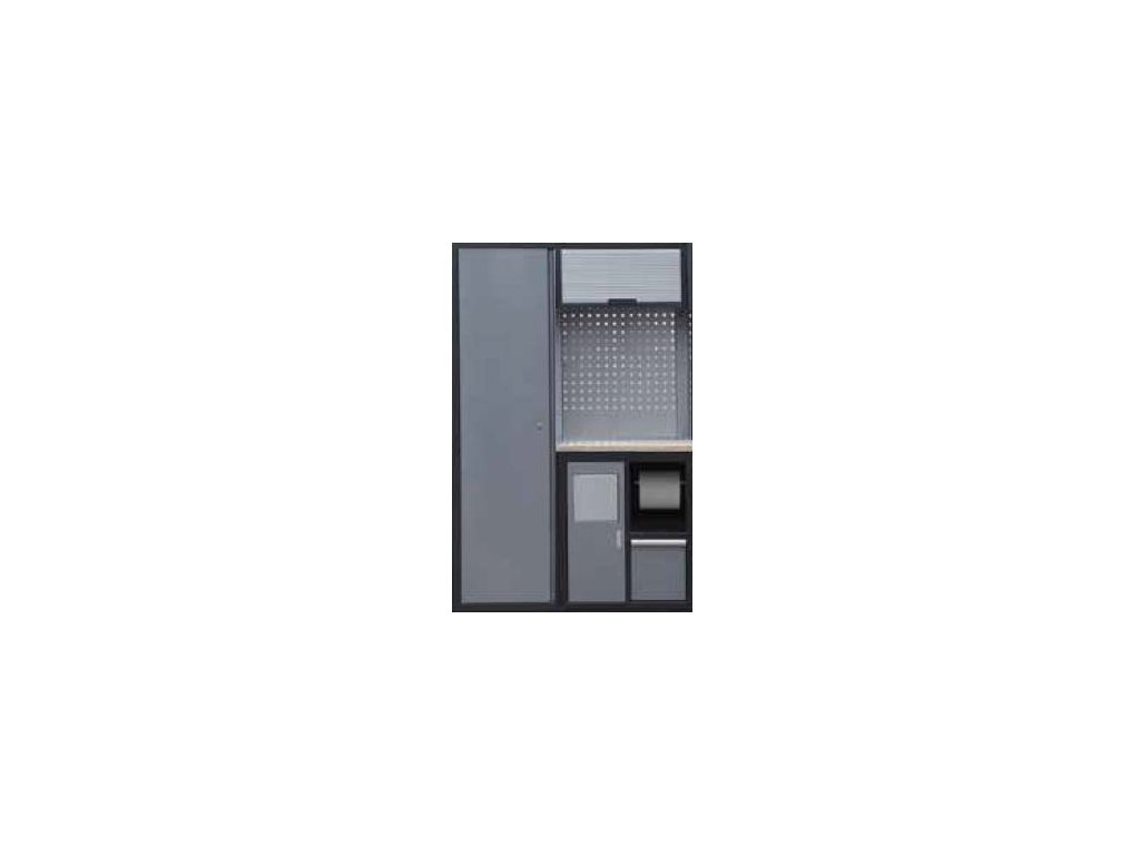 Zostava dielenského nábytku Procarosa PROFI XS-VII, táto kombinácia bola zvolená na základni menšie potreby úložného priestoru. Skrinka pod pracovnou doskou bola zvolená na usadenie odpadkového koša a držiaku na papierové utierky. Preto je táto zostava vhodná na umiestnenie v blízkosti sanitárneho zariadenia. Jednotlivé diely z ponuky Procarosa PROFI môžete ľahko kombinovať.