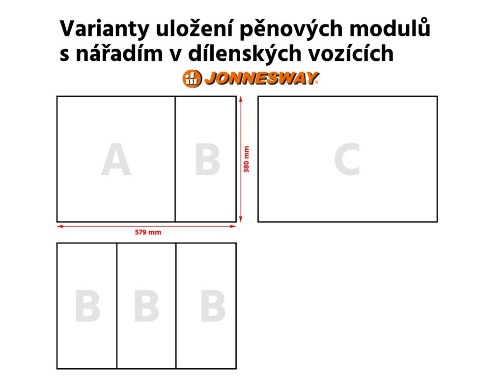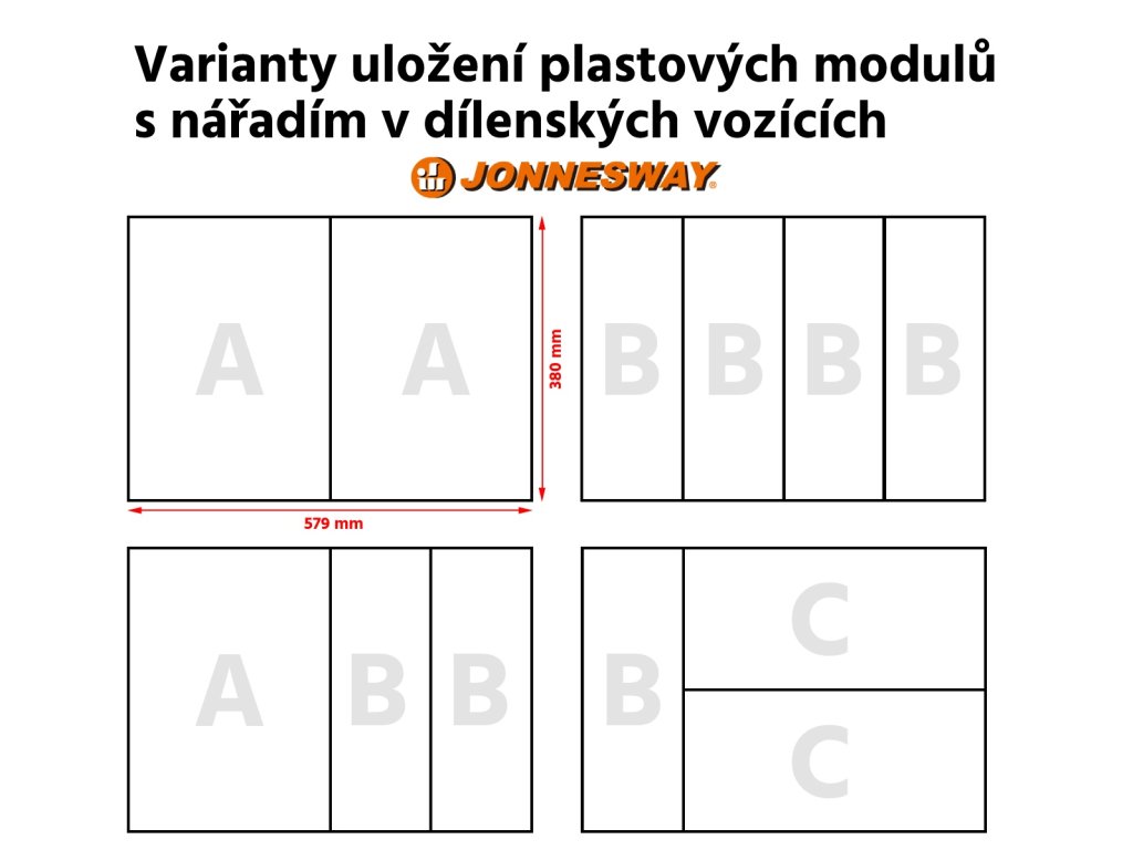 Vozík je dodávaný nevybavenej. Vďaka tomu máte možnosť individuálneho vybavenia náradím a prípravky, ktoré naozaj potrebujete. K tomu odporúčame hlavne prakticky usporiadané moduly a kazety JONNESWAY.