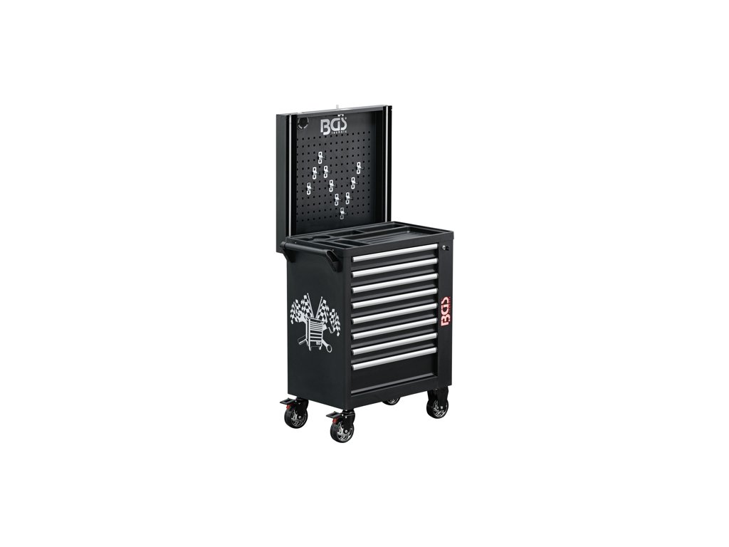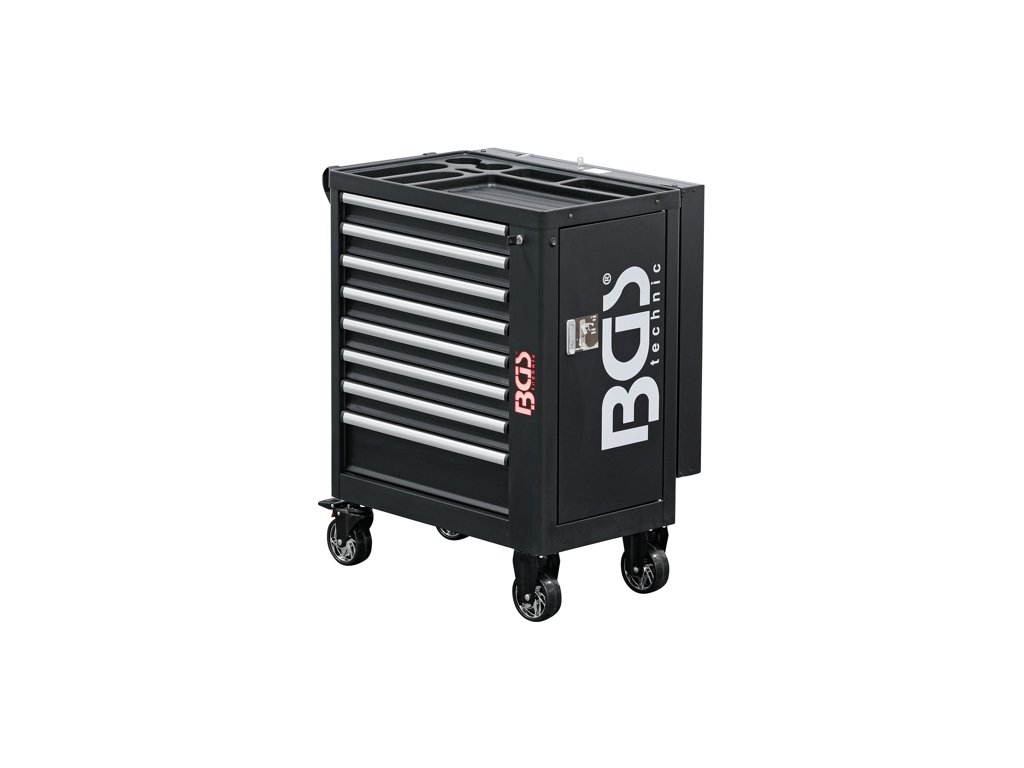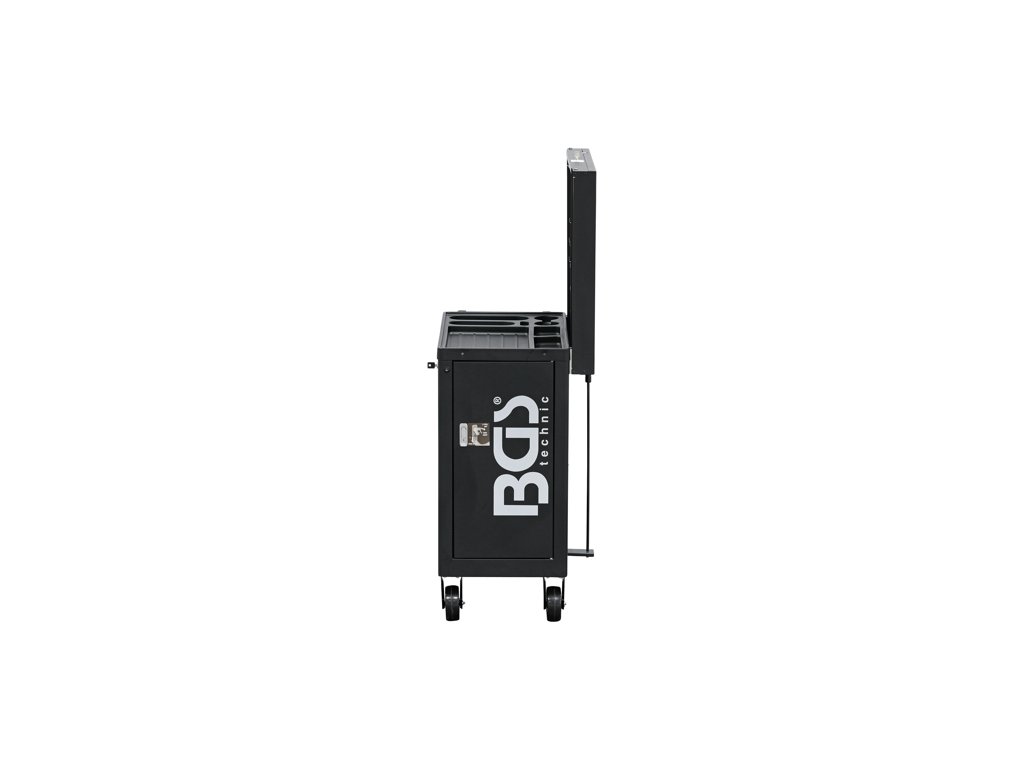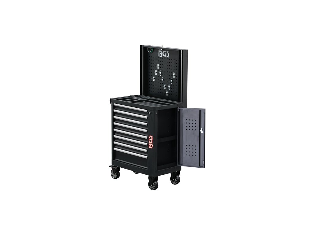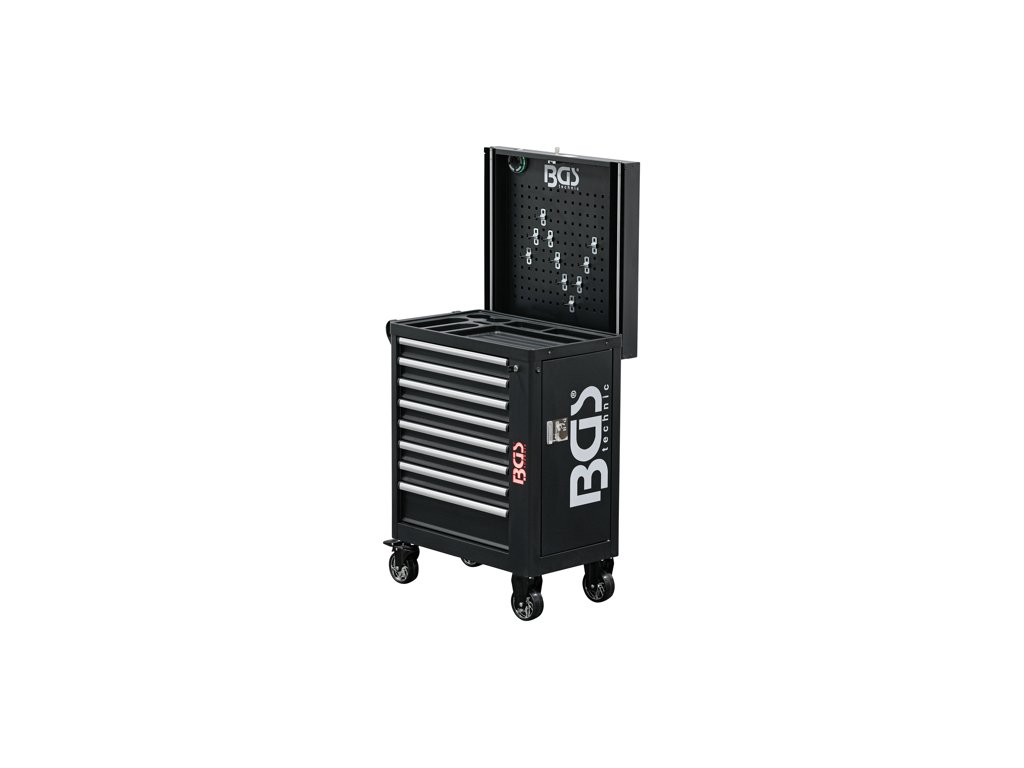 Montážny dielenský vozík s 8 zásuvkami, bočnou skrinkou a výsuvnou perforovanou stenou, s Bluetooth reproduktorom a osvetleným logom BGS na prednej strane - BGS technic 4108