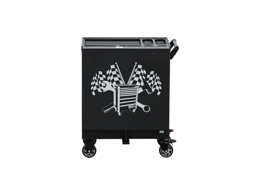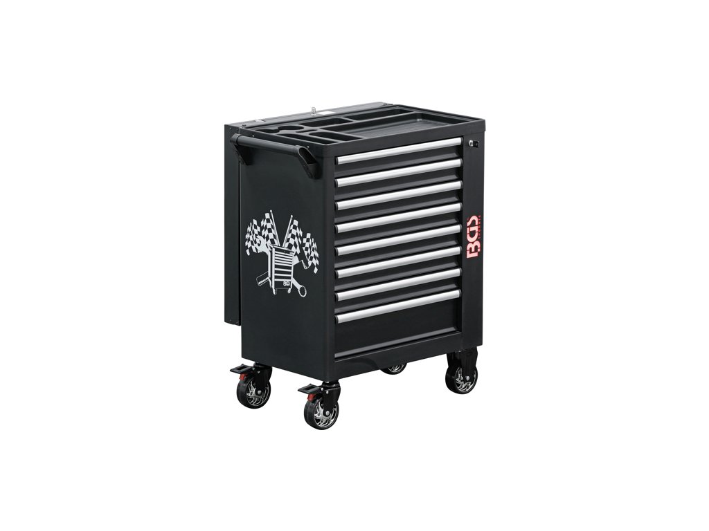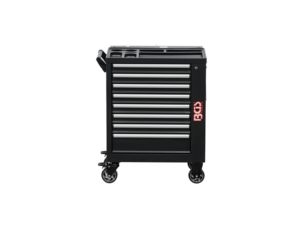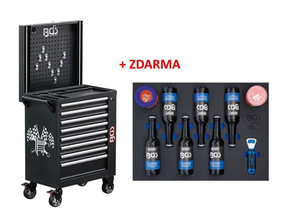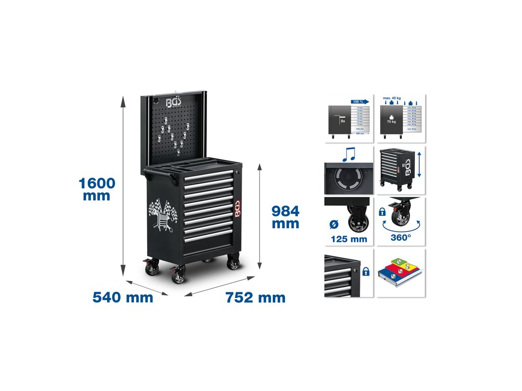Montážny dielenský vozík s 8 zásuvkami, bočnou skrinkou a výsuvnou perforovanou stenou, s Bluetooth reproduktorom a osvetleným logom BGS na prednej strane - BGS technic 4108