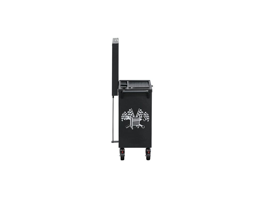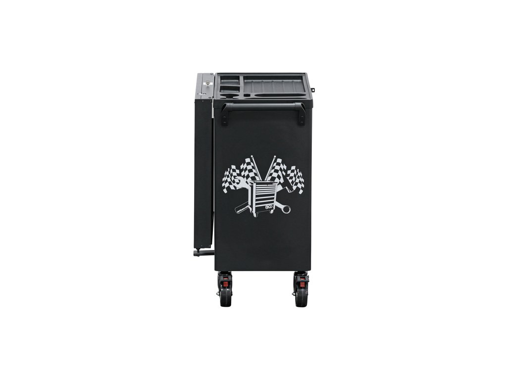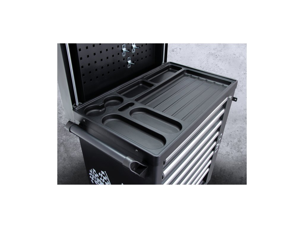 Vysoko kvalitný a premyslený dielenský vozík. S 8 zásuvkami, bočnou skrinkou a výsuvným odnímateľným zadným panelom poskytuje výnimočný úložný priestor na dielenské a garážové náradie, prípravky, spotrebný materiál atď: