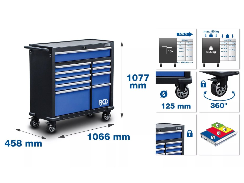 Veľmi pevný a kvalitne vyrobený vozík určený na uloženie a prevážanie autoservisného a dielenského náradia a vybavenia. Vďaka 10 rôzne veľkým zásuvkám má mimoriadne veľkú úložnú kapacitu a pojme všetko, čo potrebujete.