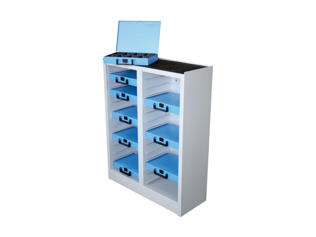 Určené na uskladnenie až dvadsaťosem plechových kufríkov s rôznych „spotrebákom“ značky Dresselhaus. Všetko vďaka tomu môžete mať pohromade a prehľadne roztriedené. Na hornú poličku je možné navyše odložiť ďalšie veci.