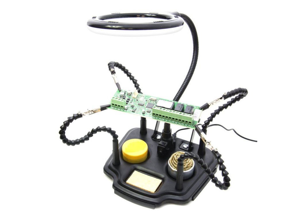 Multifunkčný držiak (stojan) na spájkovanie disponuje hneď štyrmi ramenami zakončenými krokosvorkou na uchytenie spájkovaného predmetu – konektorov, plošných spojov, dosiek a pod.
