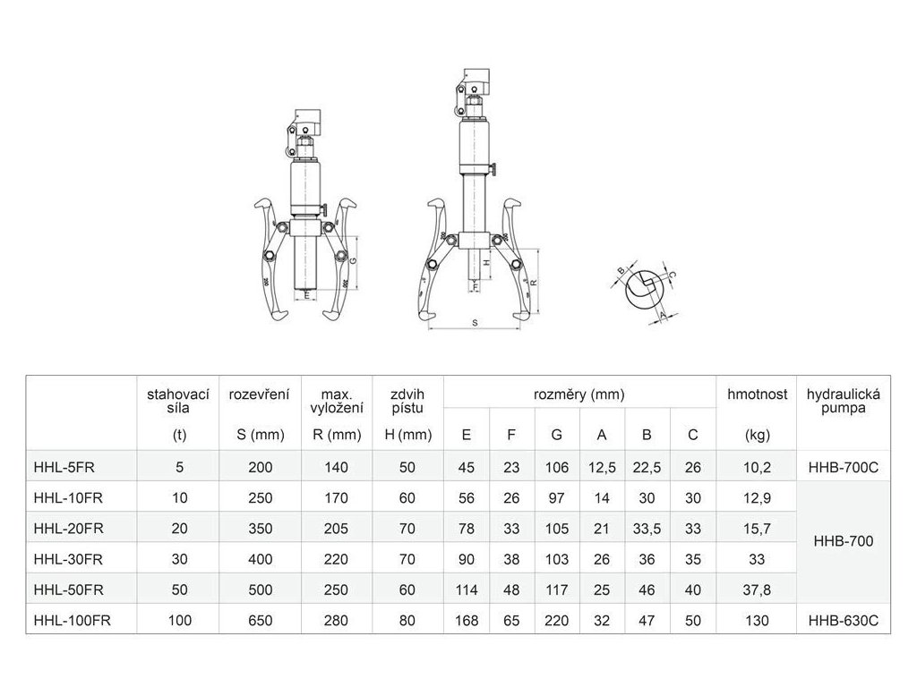 Dvoj- alebo trojramenný hydraulický sťahovák HHL-10FR, sila 10 t, s ručným čerpadlom
