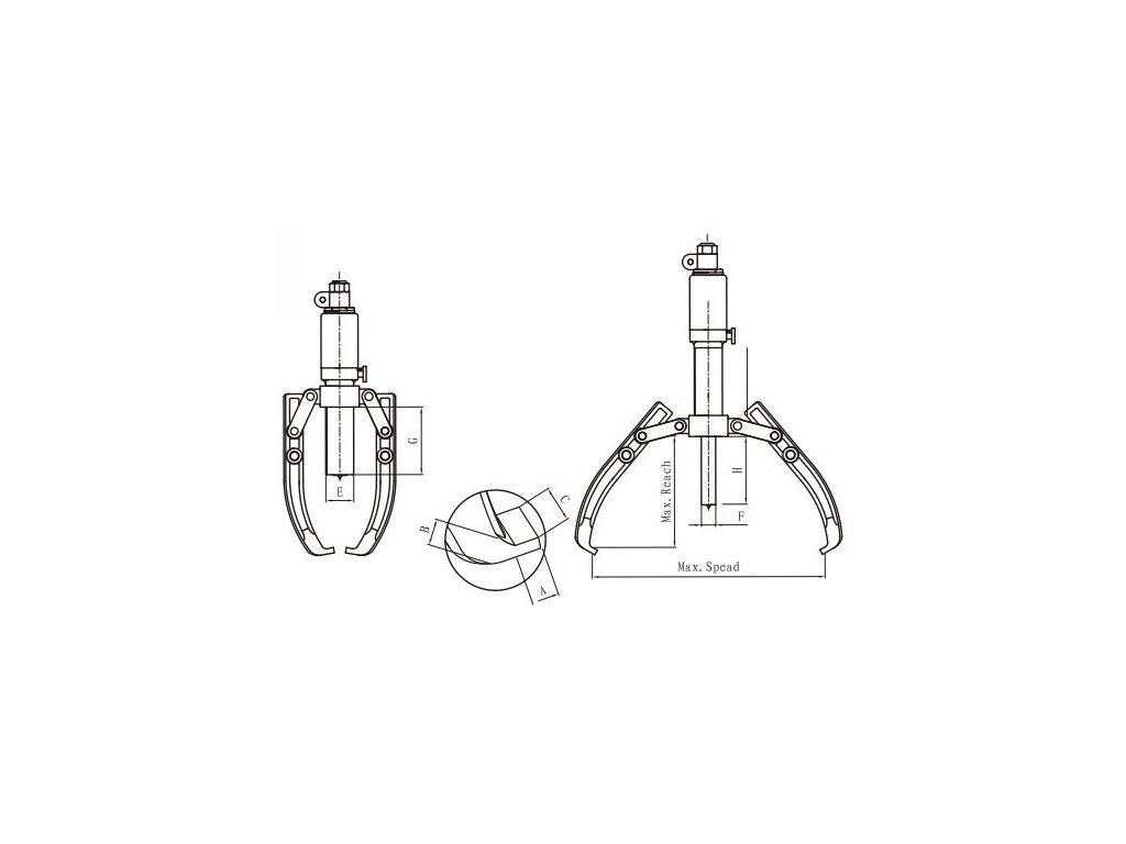 hydraulická sila maximálna rozovretia (spread) maximálna vyloženie (reach) zdvih piesta rozmery E F G A B C hmotnosť | 50 t 500 mm 250 mm 60 mm 114 mm 12 mm 177 mm 25 mm 46 mm 40 mm 37,8 kg |