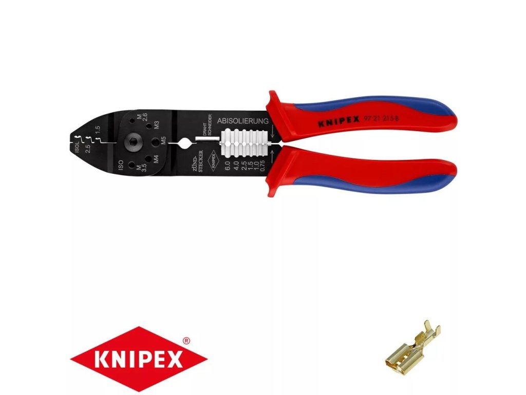 Multifunkčné kliešte určené na strihanie káblov, odizolovanie vodičov a lisovanie neizolovaných, otvorených konektorov. Kliešte sú vybavené závitovými otvormi na strihanie medených alebo mosadzných závitových kolíkov M 2,6 až M 5. Stabilnú konštrukciu zaisťuje skrutkový kĺb na hladký chod.