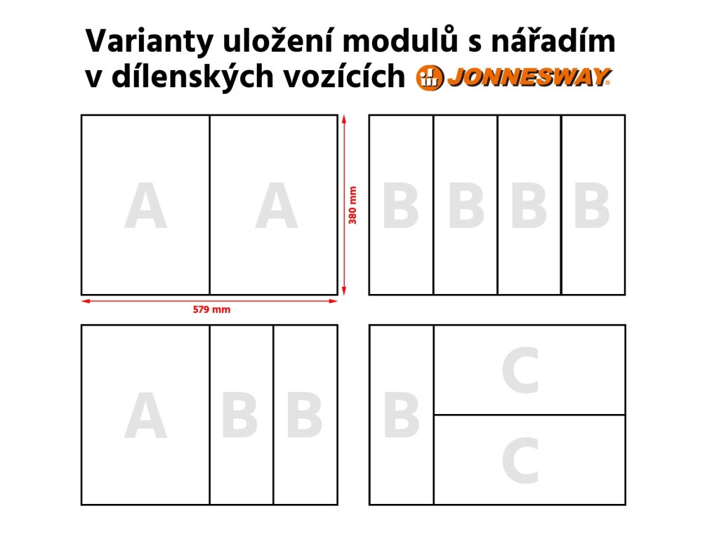 Veľmi vhodné ako príslušenstvo k dielenskému montážnemu vozíku JONNESWAY alebo sa môže používať samostatne. Praktická konštrukcia umožňuje spojenie jednotlivých modulov (kaziet) vďaka bočným zámkom.