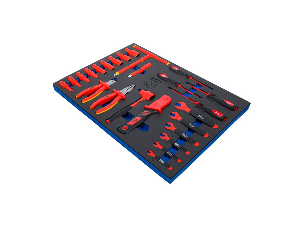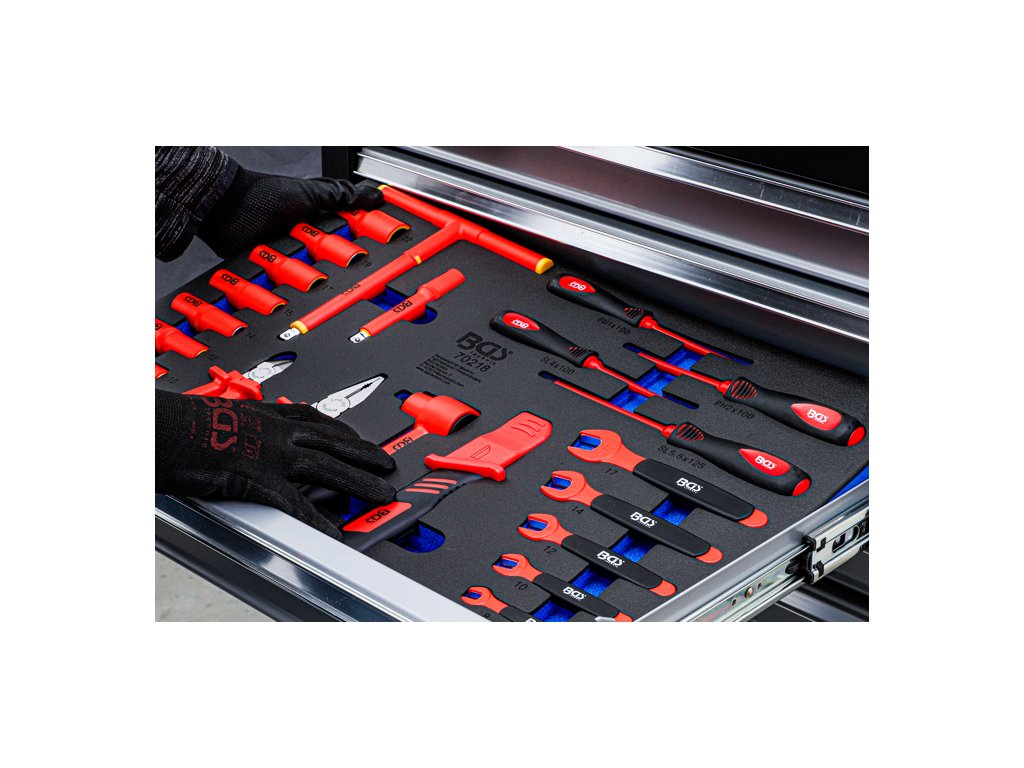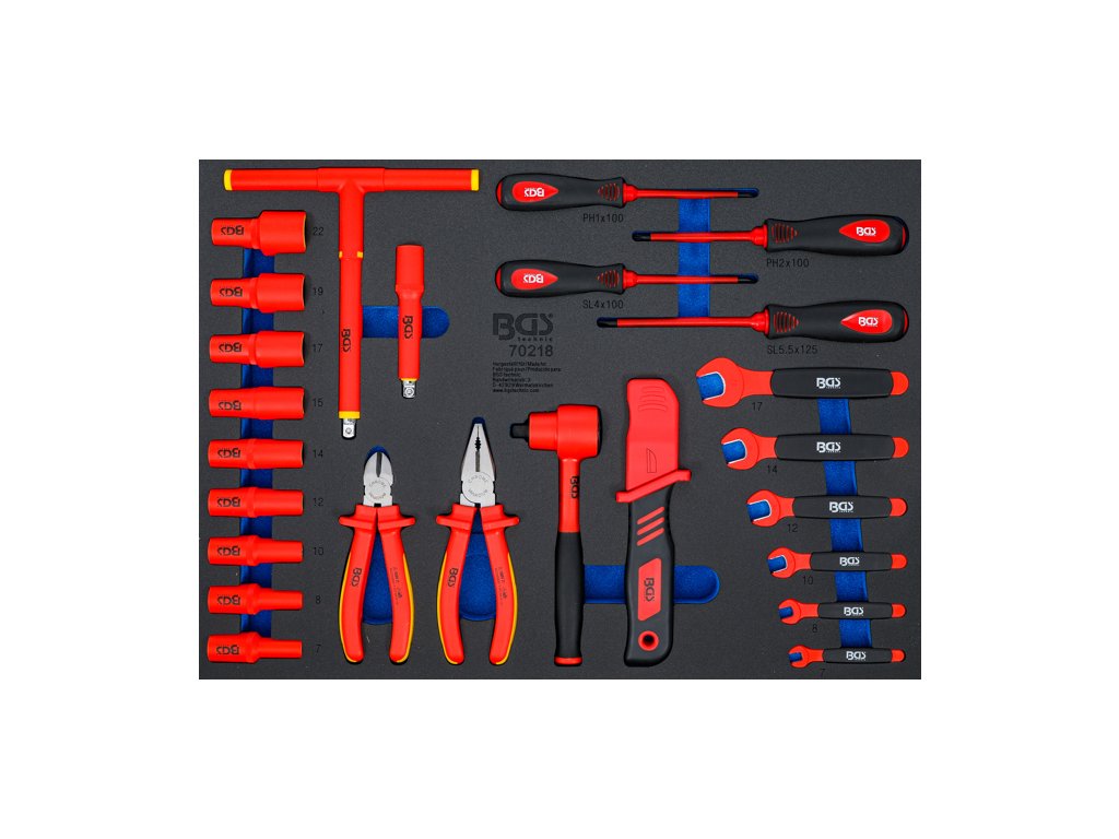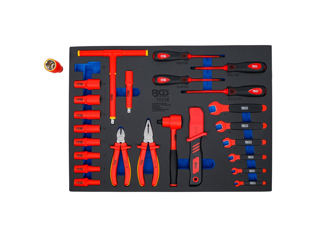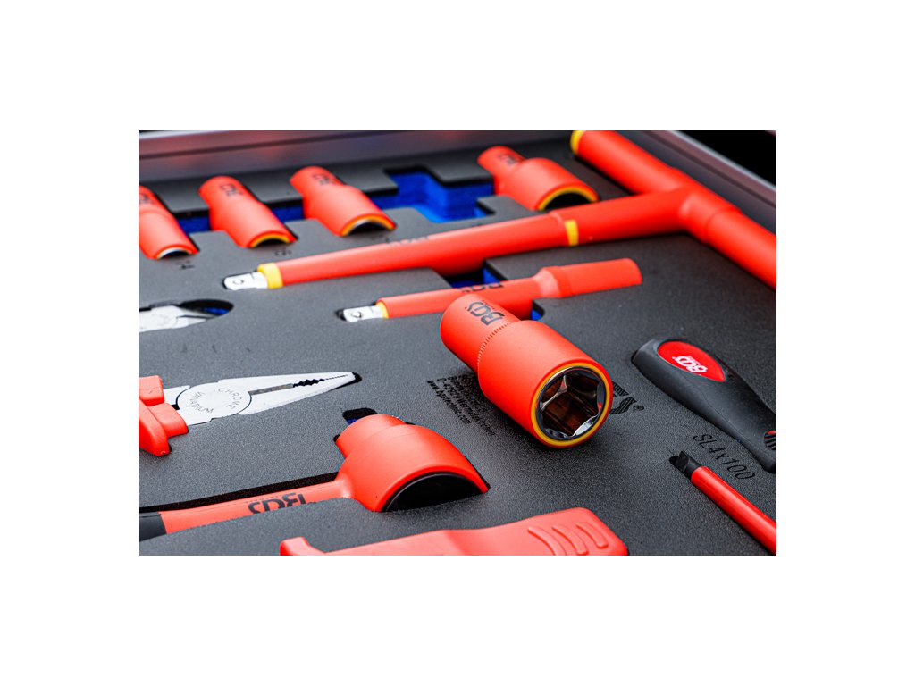 Izolovaná sada elektrotechnického náradia VDE: sada 3/8" gola, skrutkovače, odizolovací nôž, ploché otvorené kľúče a kliešte, 26 kusov v penovej vložke - BGS technic 70218