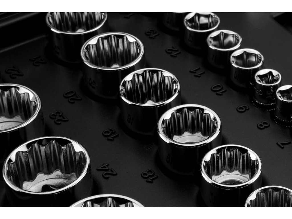 Kompletná sada nástrčných a nástrčných kľúčov a bitov z vysokokvalitnej chróm-vanádiovej ocele (Cr-V) vrátane račne a rôznych nástavcov.
