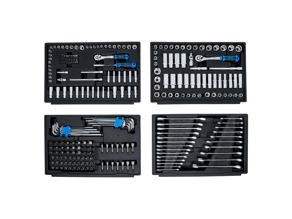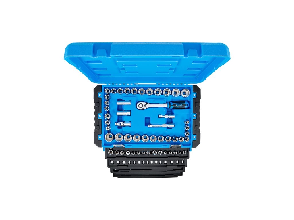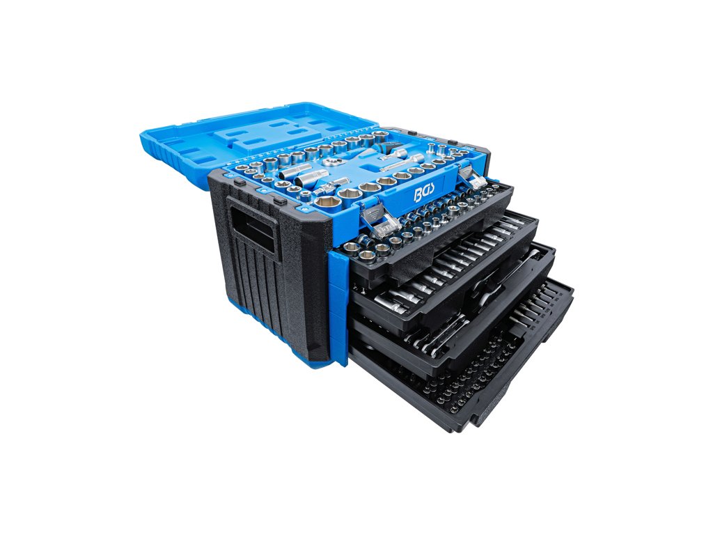 Sada metrických a palcových nástrčných hlavíc, šesťhranné hlavice 1/4", 3/8" a 1/2", so sadou bitov a kľúčov, 300 dielov v plastovom boxe (základňa na náradie) s kovovými sponami - BGS technic 74000