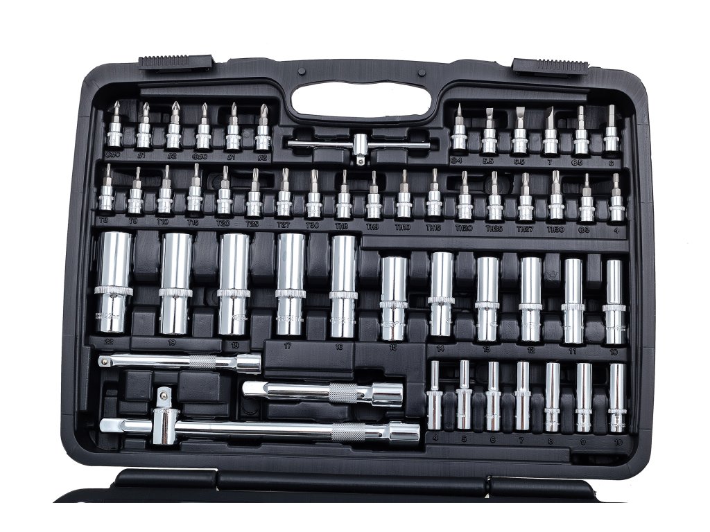Veľkosť 3/8 "obsahuje orechy od veľkosťou 10 až 19mm, dlhé orechy potom vo veľkostiach 10 až 15mm, jedno predĺženie 125mm, 6x orech E-Torx 3/8" - E10 - 11 - 12 - 14 - 16 a 18mm, štvorhranný nadstavec a račňu.