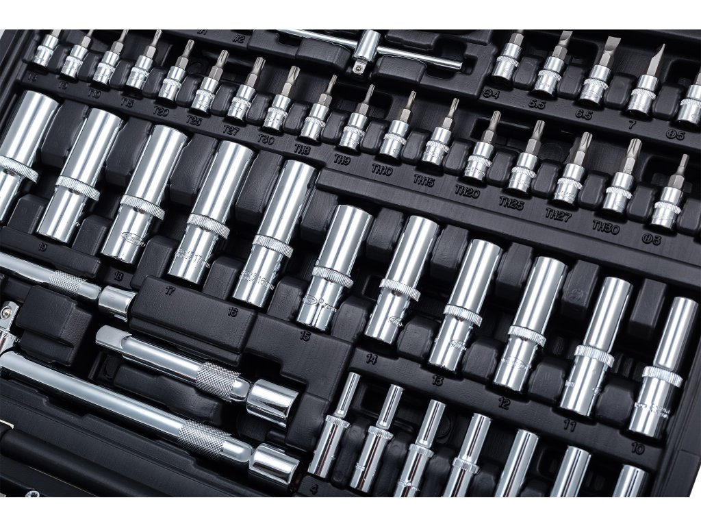 U veľkosti 1/2 "sú dostupne orechy od veľkosti 10mm do 32mm, dlhé orechy potom od 10mm do 22mm. Dve predĺženia vo veľkostiach 125 a 250mm, s ktorými sa dostanete aj k ťažko prístupným skrutkám. 1/2" veľkosť ďalej obsahuje dva nástavce na sviečky o veľkostiach 16 a 21mm, vratidlo, kardanový nadstavec, 2x orech E-Torx E20 a E24 a samozrejme račňu.