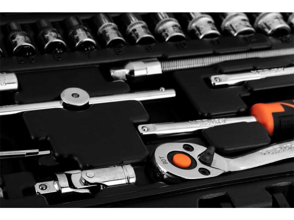 Súprava nástrčných a nástrčných kľúčov z vysokokvalitnej chróm-vanádiovej ocele (Cr-V) vrátane ráčny a rôznych nástavcov.