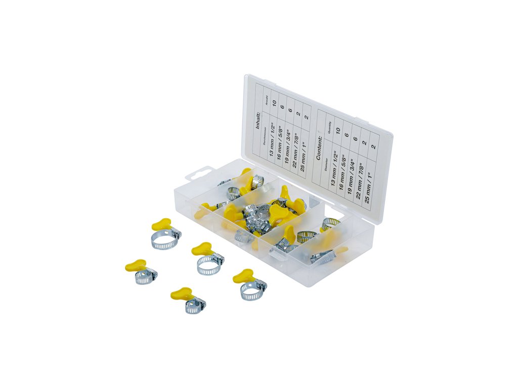 Haddicové spony so skrutkovým zámkom a integrovaným kľúčom, priemery 13 až 25 mm, sada 26 kusov v plastovej škatuľke - BGS technical 80859