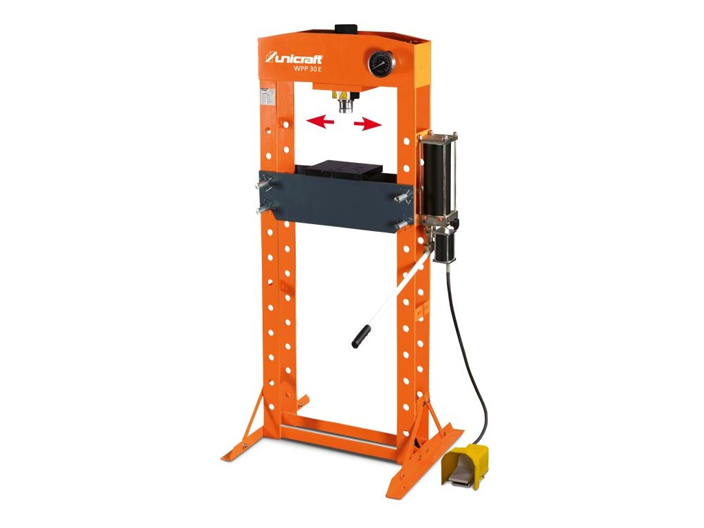 Hydraulický lis s robustným zváraným rámom s desiatimi polohami výškového nastavenia.