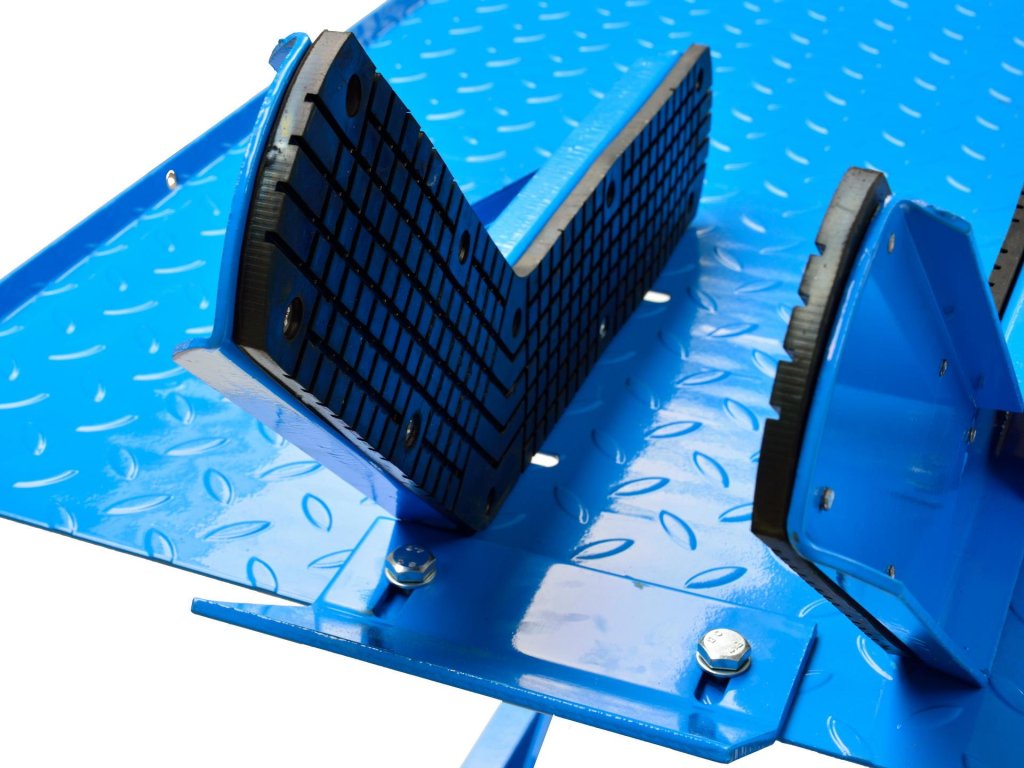 Bezpečné použitie: zdvihák je vybavený dvojstupňovým bezpečnostným zámkom (výšky 470 a 735 mm) pre prípad zlyhania hydrauliky – hever potom nespadne úplne dole. Protišmyková plocha a svorka na predné koleso s nastaviteľným rozsahom zaparkovanú motorku účinne stabilizujú. Otvory po stranách plošiny umožňujú dodatočné zaistenie motocykla šnúrami a popruhmi.