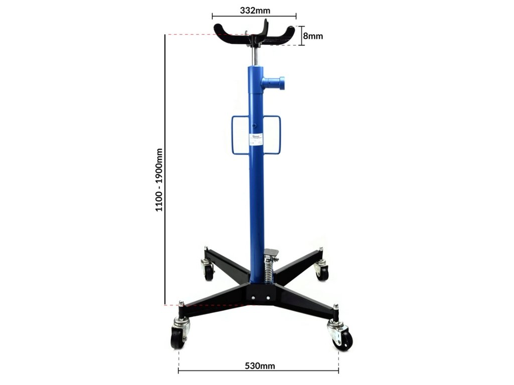 Zariadenie na zdvíhanie motora alebo prevodovky pre zaťaženie až 0,5 tony. Zdvihák prevodoviek disponuje obzvlášť silnými otočnými kolieskami, je ľahko ovládateľný a ľahko nastaviteľný. Zdvihák je vybavený hydraulickým valcom, ktorý je ovládaný nožným pedálom.špecifikácie