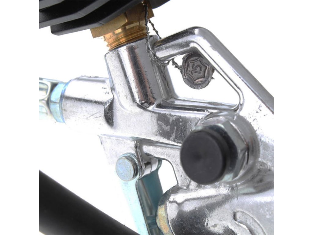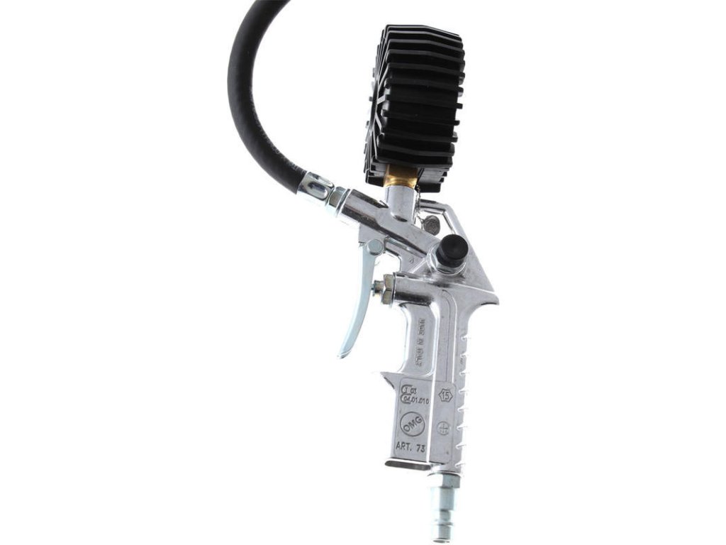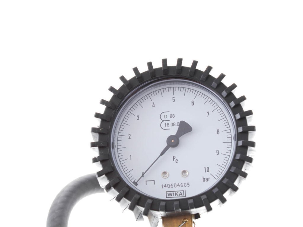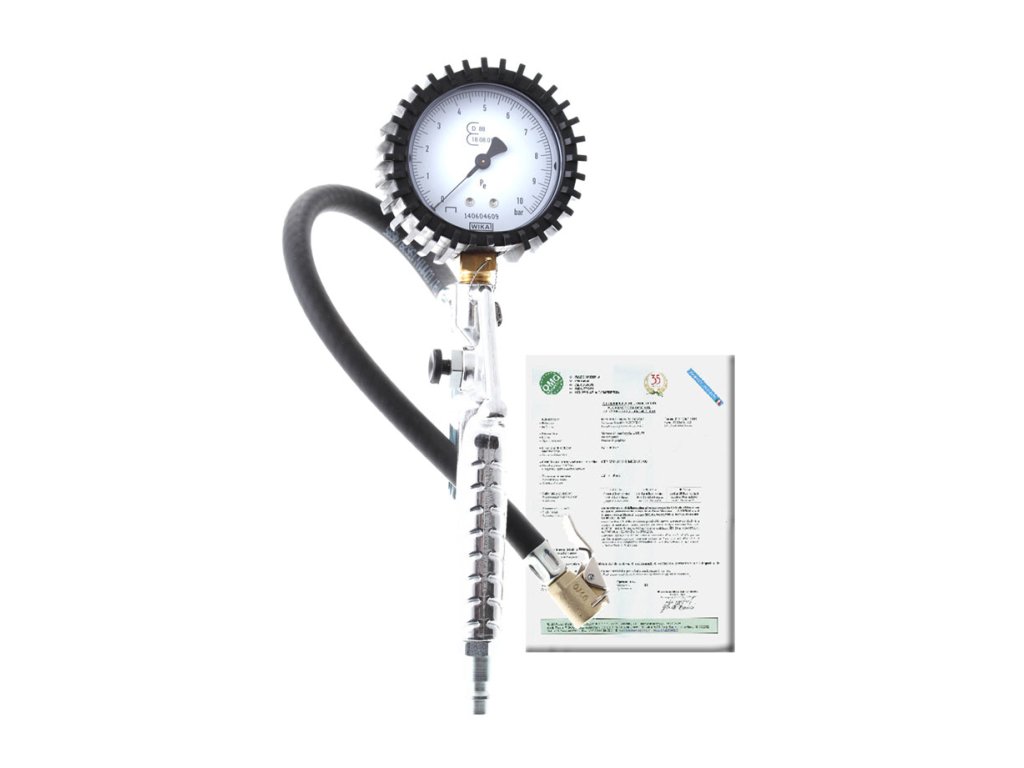 Ciachovaný pneuhustič s certifikátom pre plnenie tlaku v peumatikách.