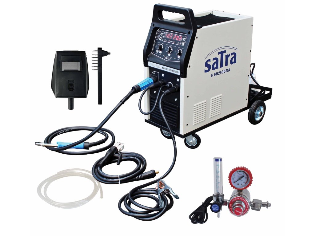 Trojfázová IGBT invertorová zváračka určená na zváranie metódou MIG/MMA/TIG LIFT, s kolieskami a plošinou na uskladnenie fľaše CO2 - SATRA S-SH250GMA.