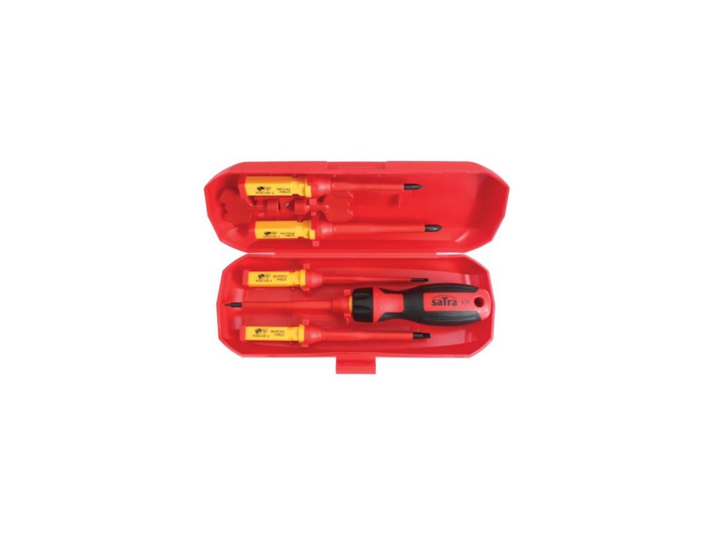 Elektrotechnická súprava - skrutkovač s vymeniteľnými hrotmi, 2 kľúče na rozvodné skrine, izolované 1000 V, sada 7 kusov v plastovej škatuli - SATRA S-VDE7S
