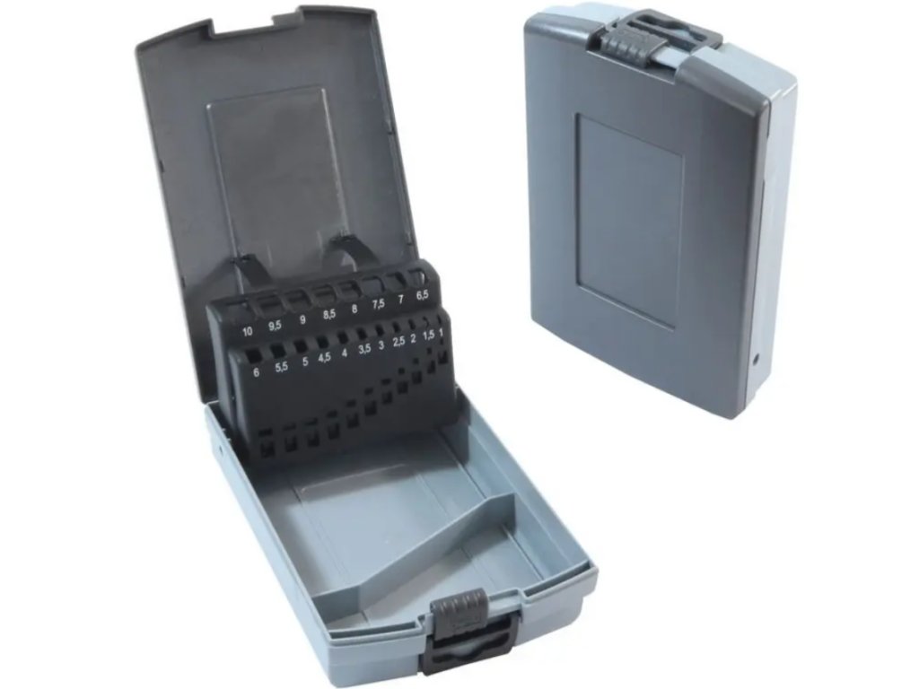 Kazeta na vrtáky, 19 kusov, 1,0-10,0 x 0,5 mm, plast, sivá