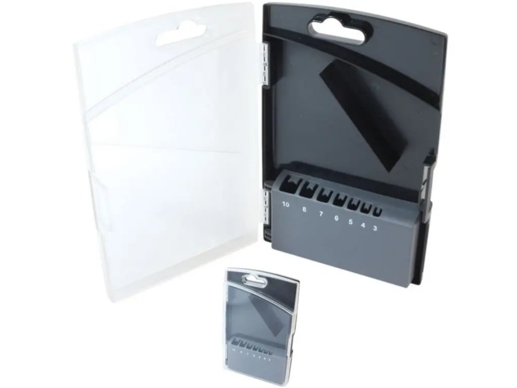 Praktická škatuľa na skladovanie a prepravu vrtákov. Obsahuje 7 otvorov pre často používané veľkosti. Vďaka priehľadnému krytu vidíte, či je súprava kompletná. Na hornej strane je očko na zavesenie boxu napríklad na stenu.