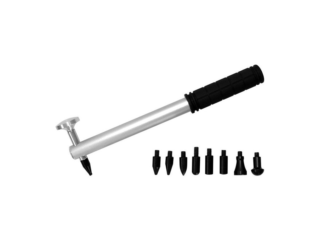 Kladivo s 10 výmennými hlavicami (1 alumíniová a 9 plastových) a násadou opatrenú krytom z mäkčené gumy pre opravy promáčklin technológií PDR.