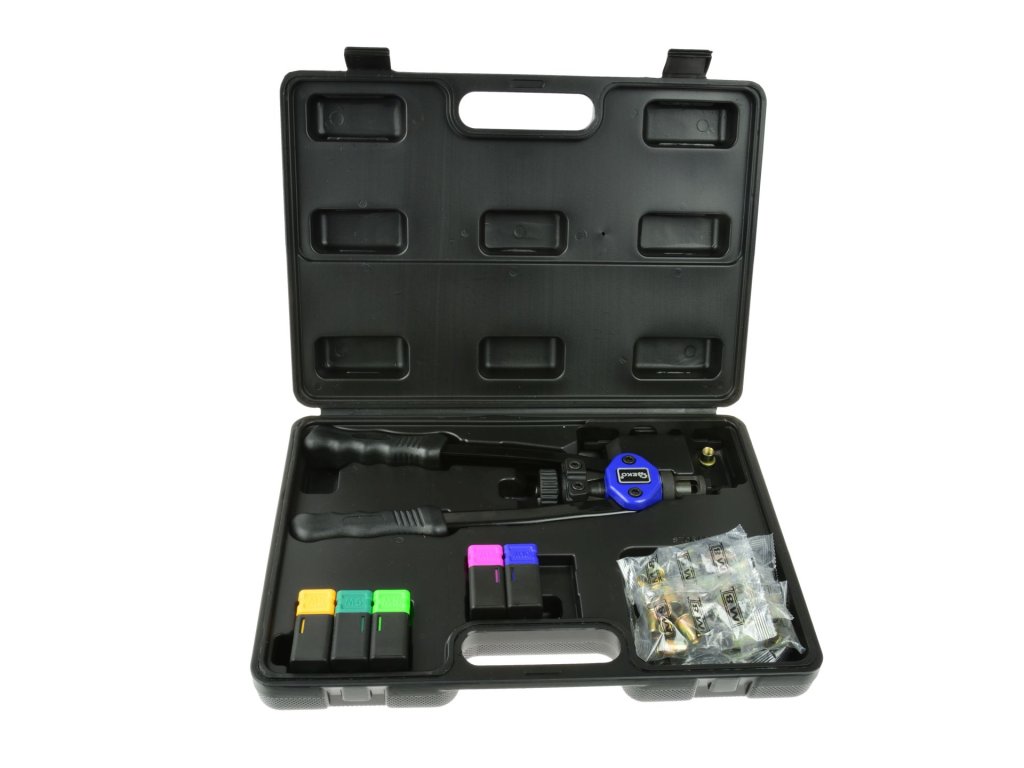 Balené v plastovom kufríku vrátane farebne značených krabičiek na nity a sadou nitovacích matíc.