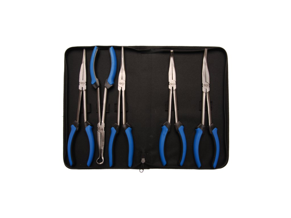 Kliešte na jemnú mechaniku – „telefónne kliešte“, rovné a zahnuté čeľuste, extra dĺžka 29 cm, sada 5 kusov v látkovom puzdre na zips – BGS technic 414
