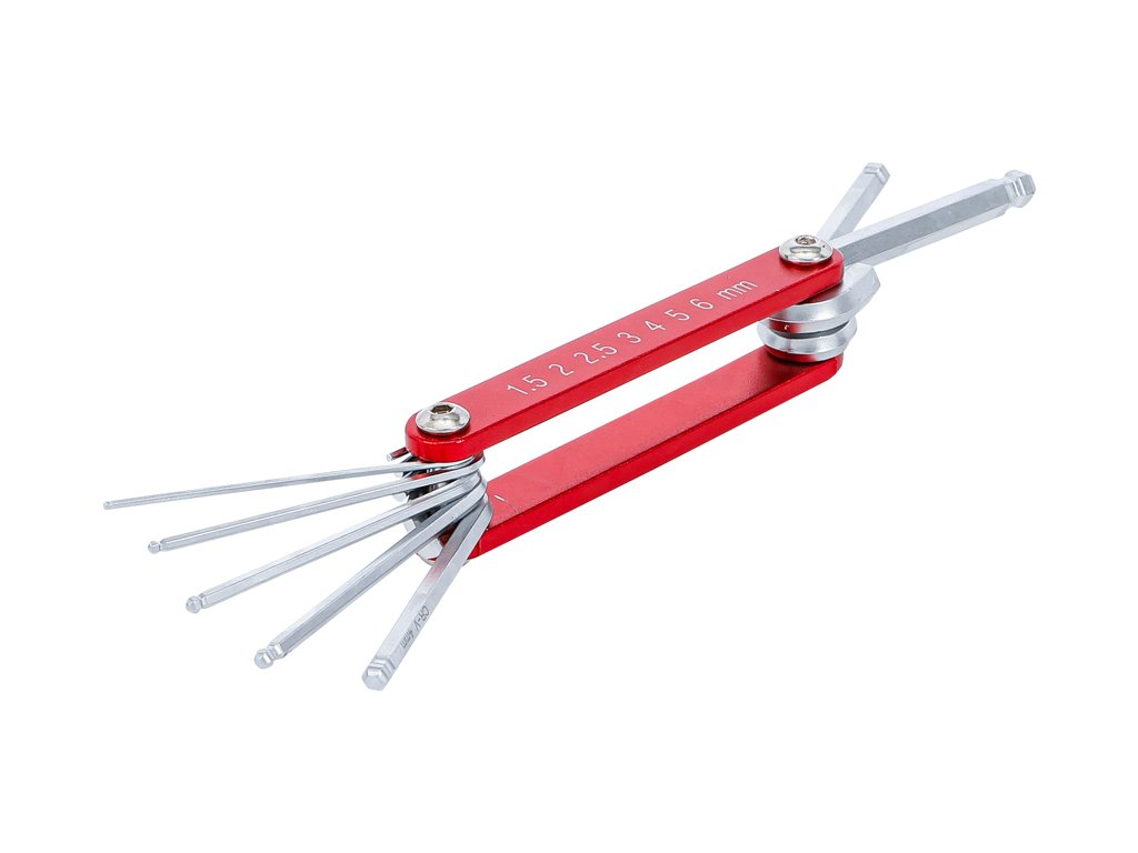 Tzv. kľúče do L so šesťhranným profilom imbusového kľúča vo všetkých bežných veľkostiach. Kľúče sú výklopné, uložené v držiaku z eloxovaného hliníka. Vďaka tomu sa dajú ľahko vložiť do vreciek a pod. Ideálne pre pracovníkov údržby a pod.