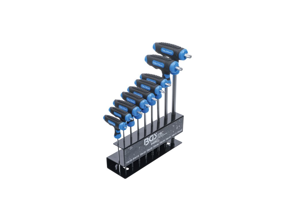 Sada nástrčných kľúčov TORX s profilmi, rozmery T10-T50, s ergonomickou T-rukoväťou, sada 9 kusov v kovovom stojane - BGS technic 8485
