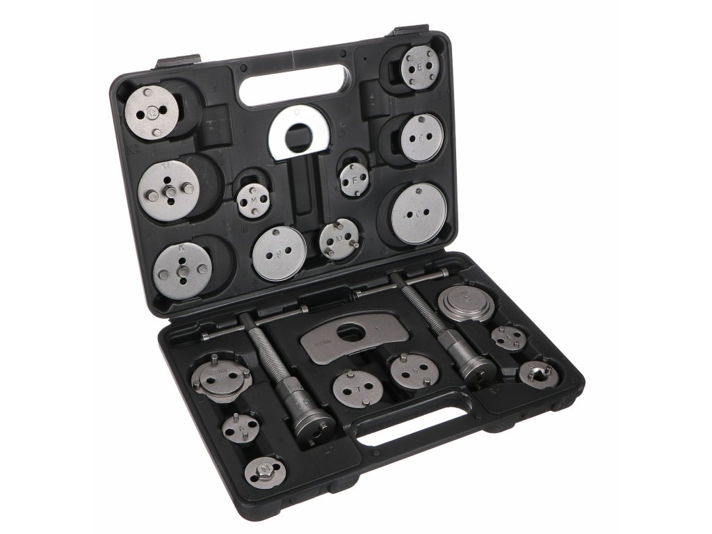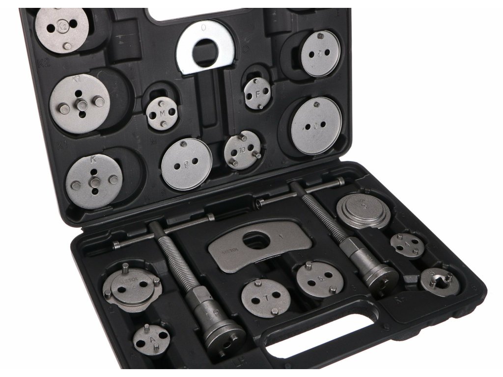 Univerzálna súprava kompresorov brzdových piestov BRAKE SET s 22 dielmi v čiernom plastovom kufríku vhodná na montáž/prestavenie piestov/pístikov kotúčových bŕzd. Súprava obsahuje pravý a ľavý kompresný kohút s magnetom, dva dorazy a 18 rôznych adaptérov. Na vozidlách s brzdovými strmeňmi kotúčových bŕzd a integrovanou jednotkou ručnej brzdy sa reverzácia brzdových piestikov vykonáva reverzáciou piestikov, na ostatných vozidlách stlačením piestikov.Obsah súpravy:
