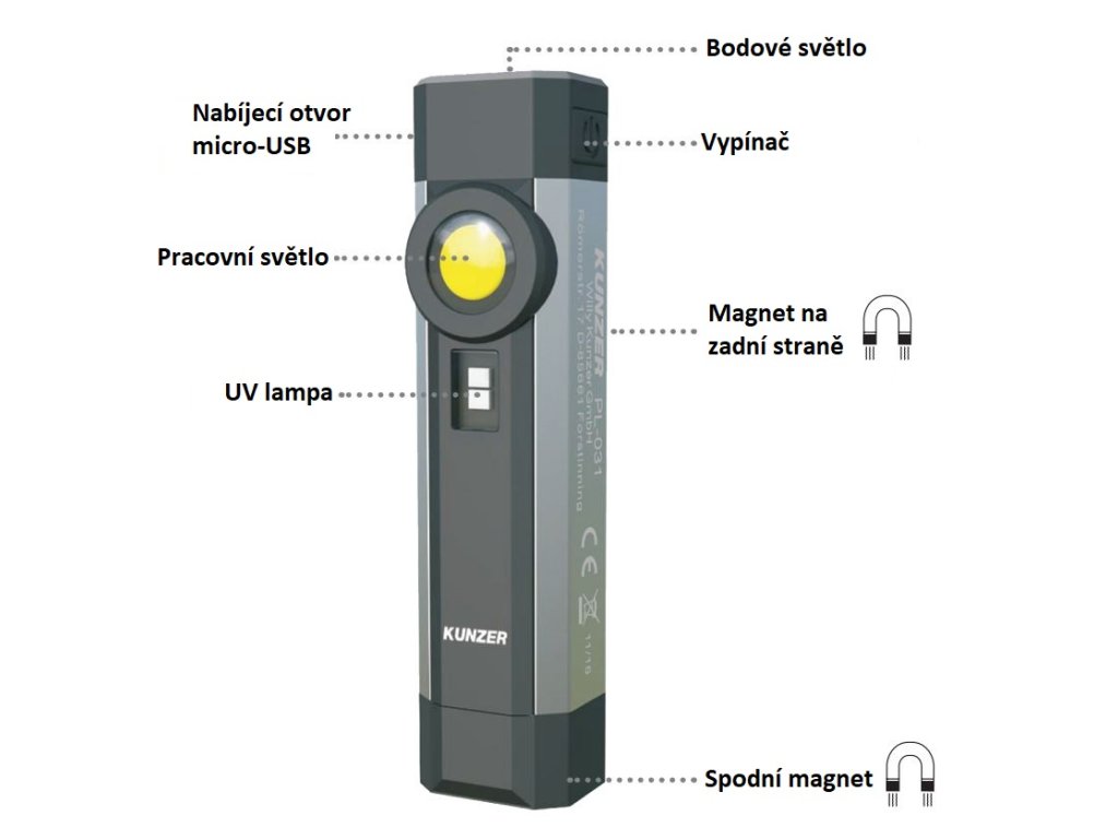 Praktická vreckové svietidlo pre kontrolu tmavých miest a osvetlenie pracovného priestoru. Hlavné svetlo LED-COB má svietivosť 250 lm, inšpekčné svietidlo LED-SMD 70 lm. Integrovaná UV lampa umožňuje zisťovať napr. Úniky, ktoré nie sú okom viditeľné.