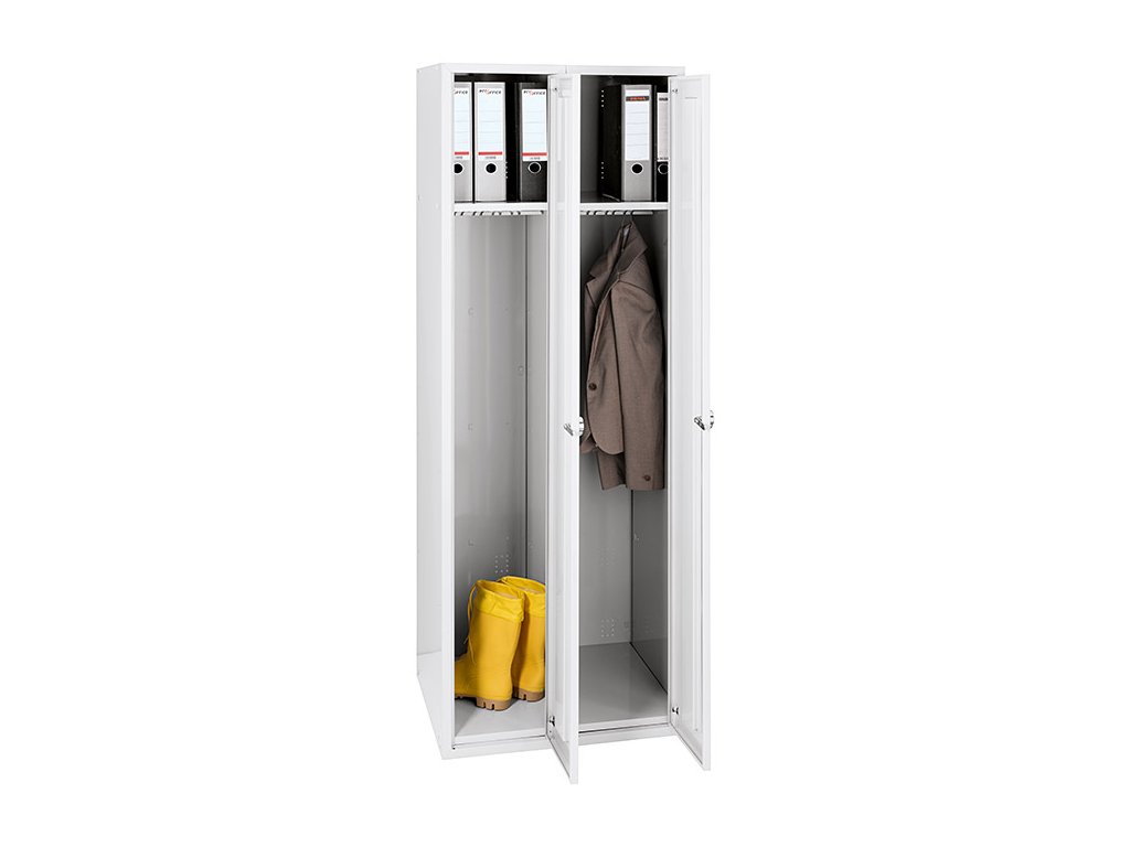 Vysoká skriňa s dvoma oddeleniami a univerzálnym využitím - do dielenských šatní, prezliekarní, pre uskladnenie dlhých a úzkych vecí apod.