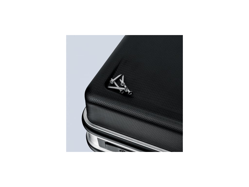 Vyrobený z ABS plastu v čiernej farbe, s pevným hliníkovým rámom po obvode kufra.