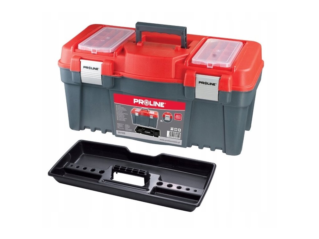 Kufr na náradie Proline PF 35722 Rozmery. Určený do garáže, dielne a pre domácich majstrov. Na uloženie menších predmetov slúži odnímateľná priehradka, ktorá sa vkladá do hlavného úložného priestoru. Veko kufra je vybavené dvoma menšími schránkami, ktoré sú vhodné na uloženie drobných predmetov (skrutky, matice, klince, menšie náradie - bity atď.). Veko je vybavené pevnými hliníkovými prackami, v závesoch sú kovové skrutky pre väčšiu pevnosť. Rukoväť kufra je ergonomicky tvarovaná a umožňuje pevné a pohodlné uchopenie.