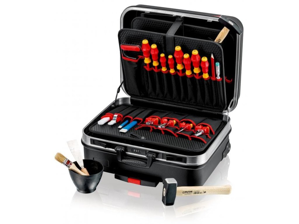 Mimoriadne prakticky poskladaná súprava náradia na komplexné opravy elektroinštalácií. Obsahuje všetko od A do Z – od vysekania otvoru do steny cez opravy rozvodov elektriny až po zapravenie diery po skončení práce. Set je vybavený 6 nástrojmi KNIPEX a celkom 24 značkovými nástrojmi, čiastočne testované asociáciou VDE podľa DIN EN 60900.